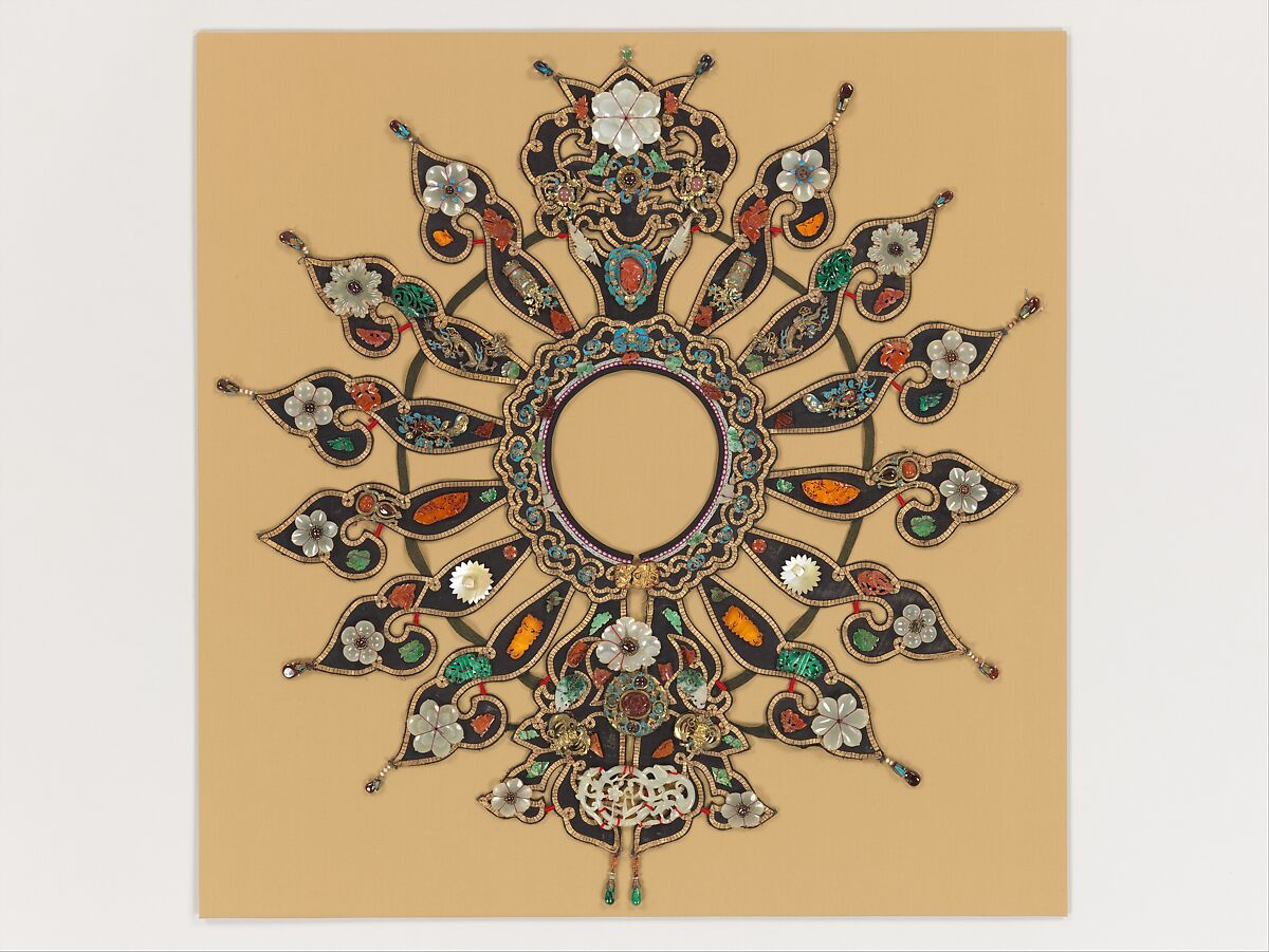 - Medium: Silk, metallic thread, jade, gilt metal, kingfisher feathers, amber, mother-of-pearl, malachite, faux pearls, glass, various stones