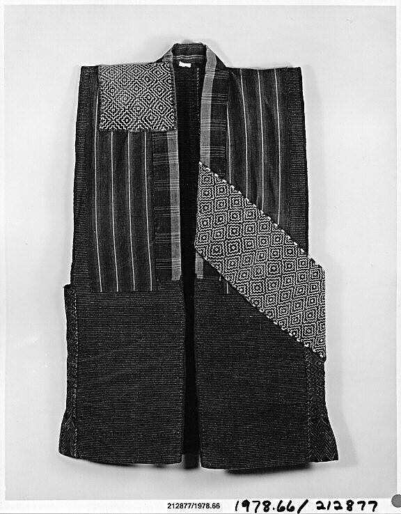 The thrift of the Shōnai farmwives is apparent in this work jacket, which was assembled from many different fabrics. The small pieces of multicolored striped cloth that reinforce the shoulder area and neckband feature silk stripes and may have come from more formal garments.