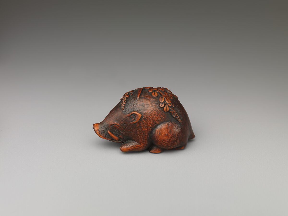 The boar, the twelfth sign of the zodiac, is thought to possess reckless courage. Here, however, his closed eyes give him the appearance of a most sympathetic and defenseless creature, sleeping hidden by autumn grasses.