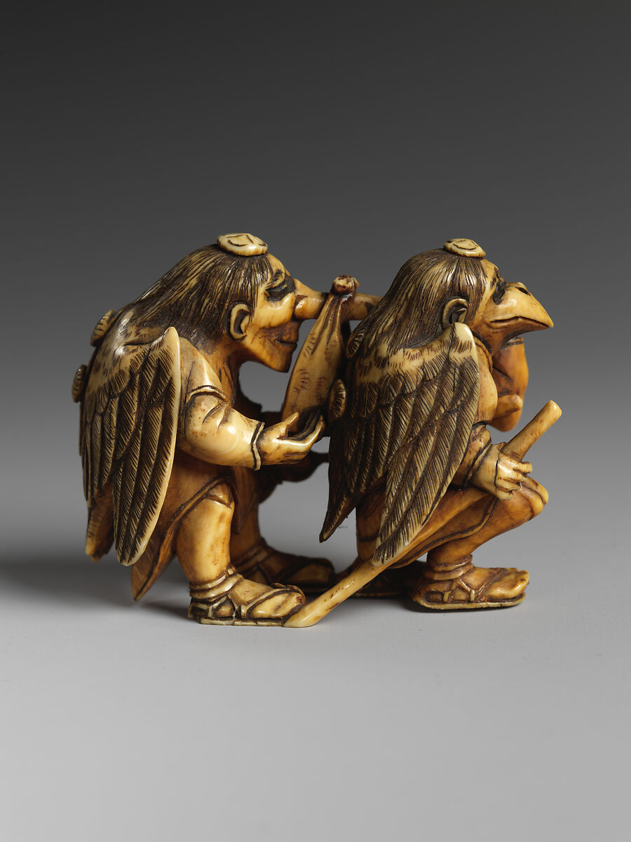 The tengu were originally thought to take the form of birds of prey and were depicted with both human and bird characteristics. The beaks of the earliest representations were later humanized as unnaturally long noses. This netsuke of a pair of winged creatures carrying a heavy load wrapped in textile, offers a fascinating glimpse of some of the most represented characters in Japanese folklore.