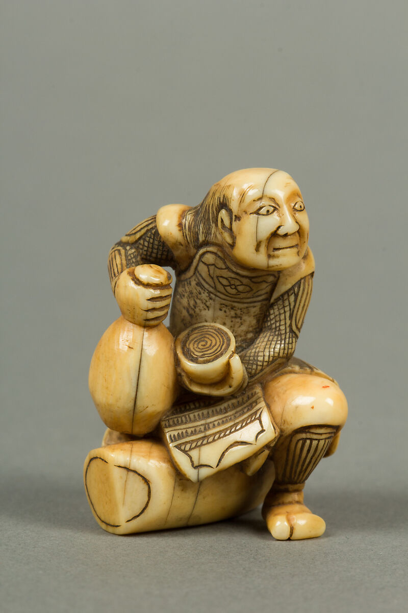 - Title:Netsuke of Man Sitting on a Log holding a Bottle and a Cup