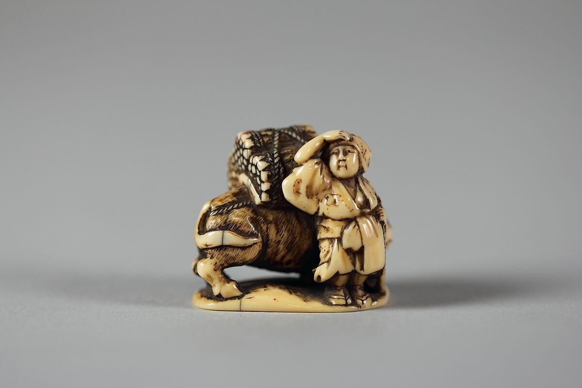 - Title: Netsuke of Man Leading an Ox with Bundles of Wood on its Back