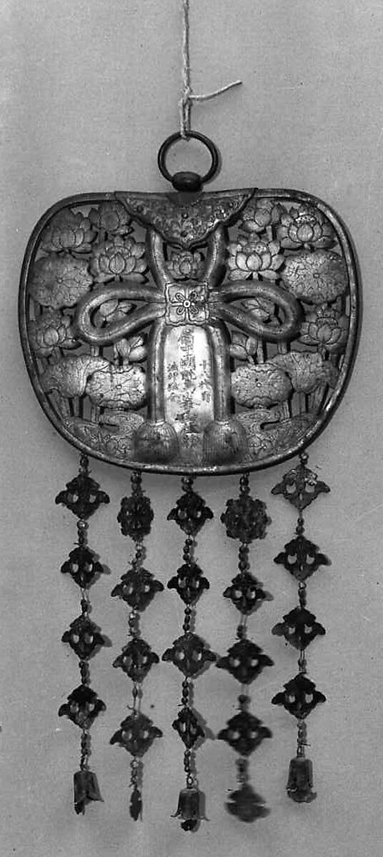 Keman (Sanskrit: kusumamala) literally means “garland of flowers,” and refers to pendant decorative disks, usually made of bronze in the shape of a round fan (uchiwa), that are suspended from beams of inner sanctuary of a temple, above a Buddhist statue. They are thought to have their origin in the garlands of fresh flowers that were offered to nobles in ancient India.