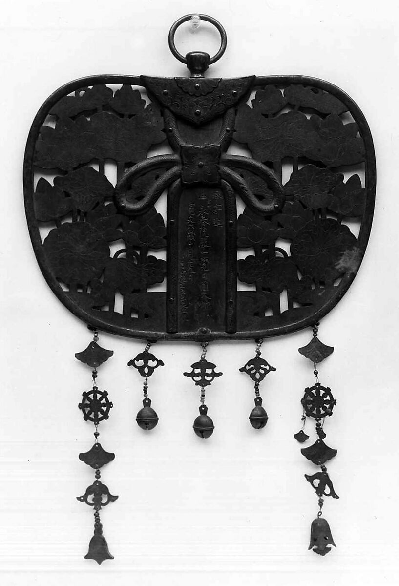 Keman (Sanskrit: kusumamala) literally means “garland of flowers,” and refers to pendant decorative disks, usually made of bronze in the shape of a round fan (uchiwa), that are suspended from beams of inner sanctuary of a temple, above a Buddhist statue. They are thought to have their origin in the garlands of fresh flowers that were offered to nobles in ancient India.