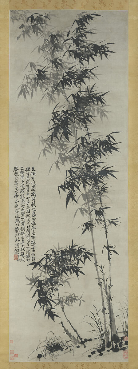 Shitao, one of the most outstanding landscape masters of his time, was also passionately in love with bamboo painting. On this monumental work, he quotes a description by Su Che (1039–1112) of Wen Tong (1018–1079), the Northern Song bamboo painter: "He dallies amid bamboo in the morning, stays in the company of bamboo in the evening, drinks and eats amid the bamboo, and rests and sleeps in the shade of bamboo; having observed all the different aspects of the bamboo, he then exhausts all the bamboo's many transformations."