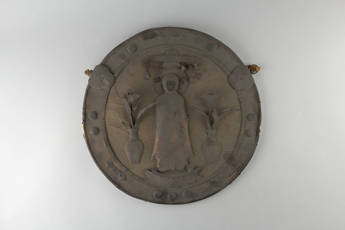 Kakebotoke, literally, “hanging Buddhas,” are usually fashioned from a round bronze or copper plate with an image of a Buddhist or Shinto deity, either separately attached or created by repousse (hammered from the rear). They derive from ritual bronze mirrors, and the term also refers to the similarly adorned large mirrors hung in Buddhist temples and Shinto shrines.