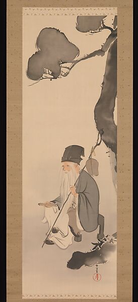 A Chinese sage with a white beard and cap sits on a stool beneath a wizened pine, a scroll in his right hand and a staff of gnarled wood in his left. He is the Daoist immortal Shoulaoren, better known in Japanese popular culture as Jurōjin, who counted as one of the Seven Gods of Good Fortune. While Rinpa painting is typically associated with motifs and subjects derived from the Japanese literary canon, here, mottled ink (tarashikomi) is masterfully deployed to represent the landscape setting for a portrait of the legendary Chinese figure. Buddhist and Daoist subjects are commonly considered the territory of Kano-school painters, whose brushwork is characteristically angular. Here, the artist’s cheerful rounded forms give the esteemed immortal an entirely different sensibility. The scroll in the man’s right hand has various interpretations—by some accounts it records the life span of all living beings, while in others it catalogues their deeds, both good and bad. In some cases, the scroll is said to be a Buddhist scripture or a symbol of wisdom.