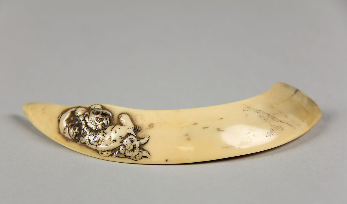 The front of this boar tusk netsuke is decorated with a shishi (guardian lion) and a cub. The back is embellished with a series of finely incised roundels of poet portraits and poems.
