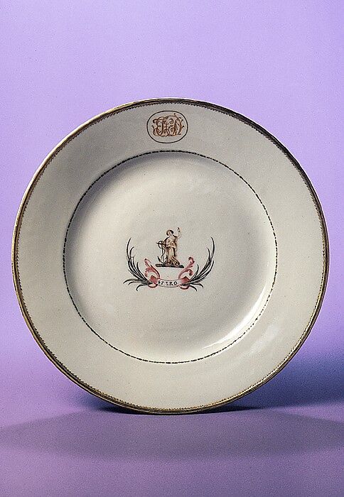 This plate was part of a large service bearing the crest and cipher of Elias Hasket Derby. Derby, a wealthy Salem merchant, was influential in establishing trade between America and China. The plate descended in his family.
