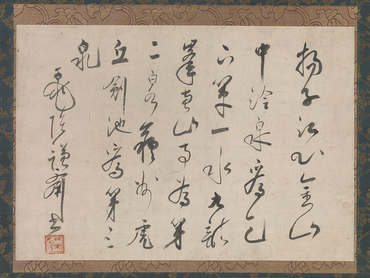 The Zen Buddhist monk Sakugen Shūryō traveled to China twice on trade missions, in 1541 and 1547, when as chief envoy he was granted an audience with the Ming emperor. Sakugen kept detailed accounts of his travels and transcribed inscriptions on plaques and tablets at famous sites. This dynamically brushed section records notes on celebrated water springs in the Jiangsu region, which he visited during his first trip: “The spring named Zhon Lingquan on Mount Jin, at the heart of the Yangzi River, is called the Number One source of water under Heaven. That of the Huishan Temple at the Jinlong Feng is counted as Number Two. Jianchi Pond at Huqiu Temple in Suzhou is Number Three.”