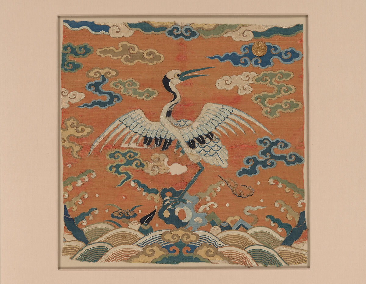 The bird shown on this badge is a crane, corresponding to the highest rank of civil official. The badge is woven in a fine silk tapestry weave (kesi) with some details, especially outlines, in metallic thread. The sun, at the upper right, was a Qing-dynasty innovation not found on Ming badges.
