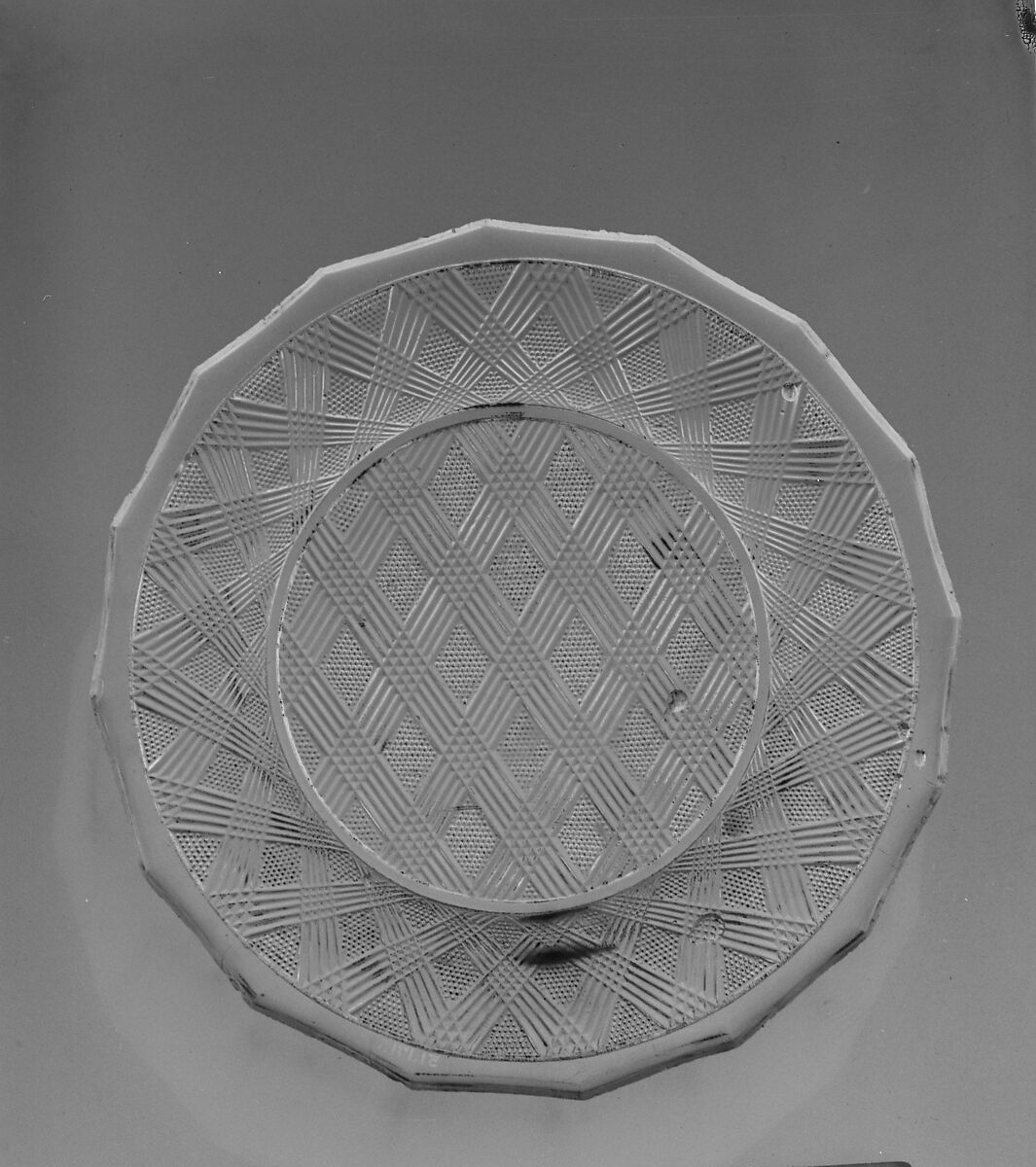This plate is pressed in a "Scotch plaid" design. It is unclear as to whether this piece is an early example of Sandwich production or a mid-nineteenth century or even later American or European work.