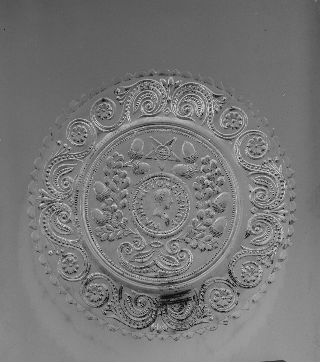 This portrait bust plate was probably pressed in honor of the centennial anniversary of George Washington's birth. It is identical to 45.100.218.