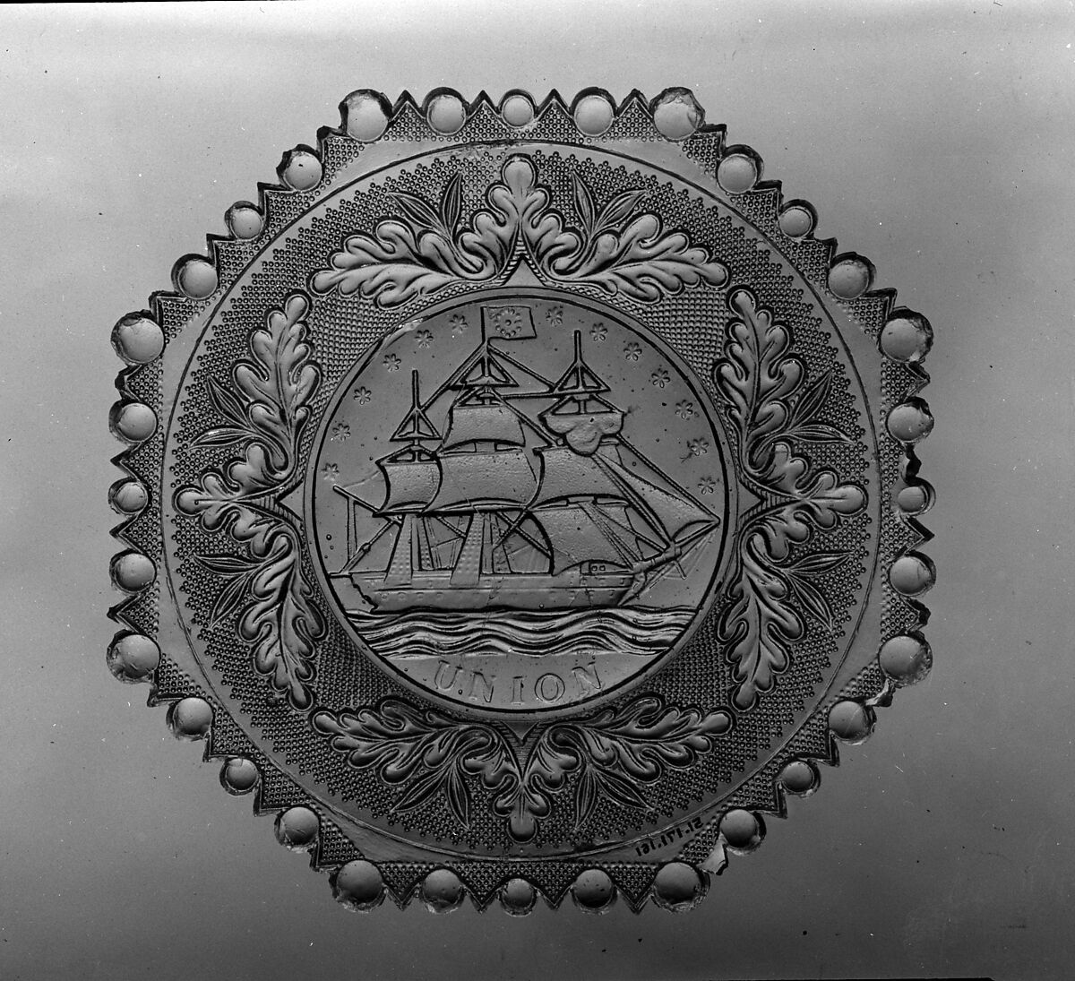 The significance of the word "Union" on this plate is unclear. There is speculation that the boat represents the U.S. Frigate Constitution. This plate would then reflect the patriotic fervor which accompanied the successful campaign to save the battleship during the early 1830s. The presence of thirteen stars in a semi-circle above the centrally placed frigate suggests a patriotic significance for the vessel. "Union," then would refer to the still young nation, and specifically to the feeling of unity and cohesiveness fostered by the national campaign to save "Old Ironsides."