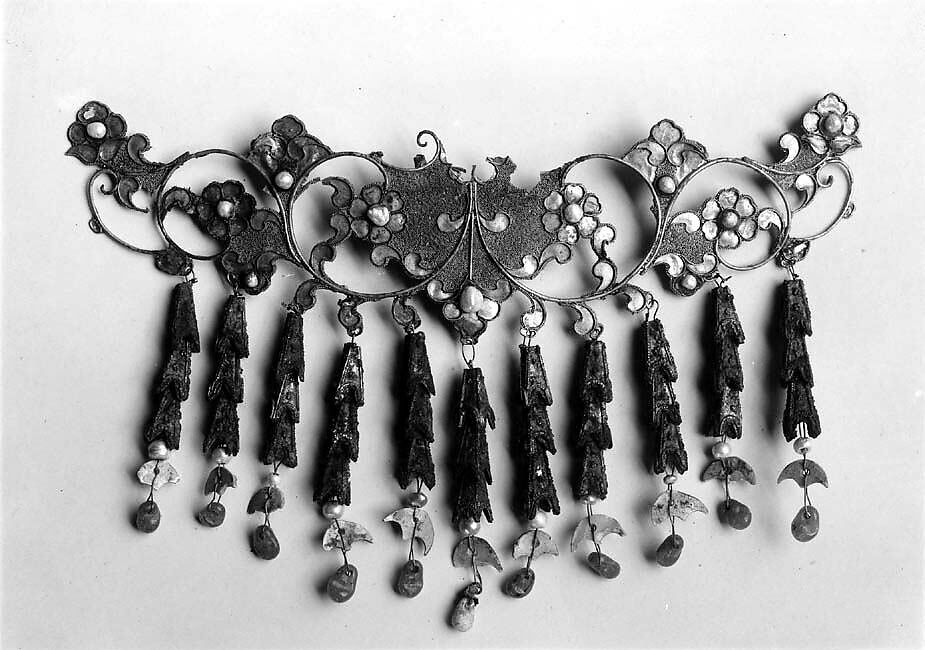 - Medium: Gold, silver, pearls, glass beads
