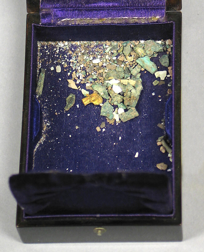 - Medium: Small pieces of bronze mounting, dust of pearls and mother-of-pearl, a small piece of gold jewelry