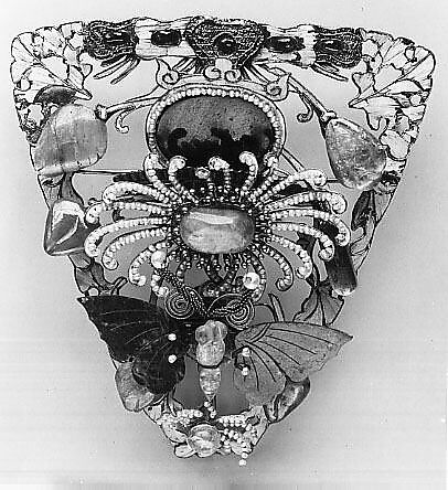 - Medium: Metal, feathers, jade, seed pearls, coral, topaz, glass