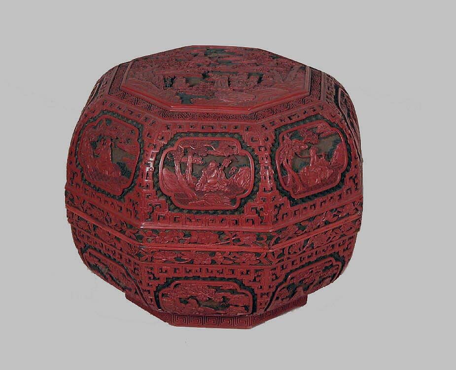 Boxes in this shape are often fitted with trays that have recesses for holding cups to serve wine at celebrations. The design on this example shows Daoists welcoming Shoulao, the god of longevity, as he descends from the heavens on a crane—apt imagery for a vessel used to mark a birthday and convey wishes for a long life. A historical group of Daoist immortals is seated in the individual cartouches carved on the sides of the box.
