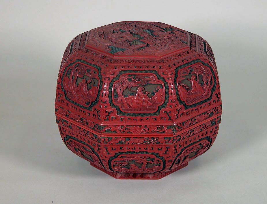 Boxes in this shape are often fitted with trays that have recesses for holding cups to serve wine at celebrations. The design on this example shows Daoists welcoming Shoulao, the god of longevity, as he descends from the heavens on a crane—apt imagery for a vessel used to mark a birthday and convey wishes for a long life. A historical group of Daoist immortals is seated in the individual cartouches carved on the sides of the box.