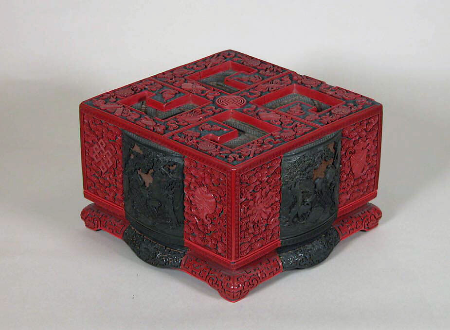 This box is a quintessential example of the intricate layered surfaces that characterize carved lacquer in the eighteenth and nineteenth centuries. On the lid a geometric background supports a stylized Chinese character for shou, or longevity, which is itself decorated with auspicious motifs such as bats (the Chinese word for which is a homonym for "good fortune"). The four raised black-lacquer panels on the side of the box are carved with scenes of deer and cranes-both symbolic of longevity-in landscapes. They are surrounded by lush clouds that contain the Eight Treasures: a conch shell, a lotus wheel, a parasol, an endless knot, a pair of golden fish, a banner, and a treasure vase. These auspicious symbols, derived from Buddhism, appear often in later Chinese art. Boxes of this shape were used to hold small treasures of various materials and are therefore frequently referred to as treasure boxes.