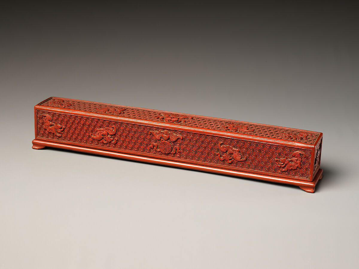 This luxurious lacquer box was designed to hold a writing brush from the imperial workshops. The main images on the box are of bats flying over waves. In Chinese, the word for “bat” is pronounced the same as “fortune” (fu). Thus, the bat is an auspicious animal symbolizing good fortune, as opposed to its negative connotations in the West.