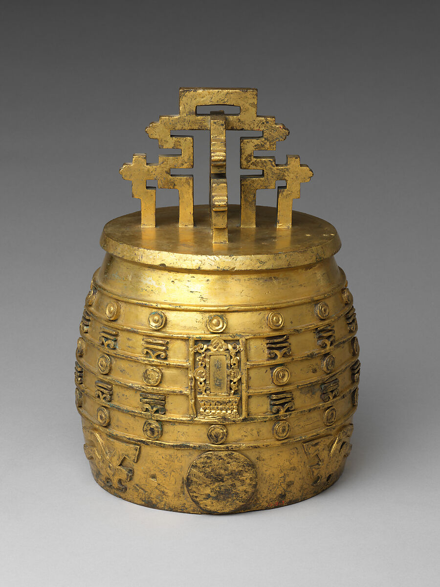 Often juxtaposed with a set of jade chimes, bronze bells were suspended from wooden frames and played at state ceremonies and banquets. The Qianlong emperor was prolific in commissioning chime sets for state altars and palaces. This current piece features openwork suspension crowns and geometric patterns for which no precedent among chime bells is known.
