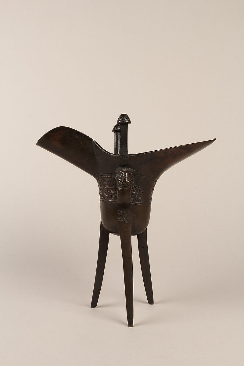 A jue is used to serve warm wine during rituals. Its particular shape—flared, pointed, triangular legs; ovoid body; long curved spout counterbalanced with a pointed flange; and two columnar protrusions—makes jue one of the most easily identifiable ancient Chinese bronze and pottery vessel forms. In later periods, jue were still made for ritual use and Qing-dynasty (1644–1912); examples often have elongated legs.