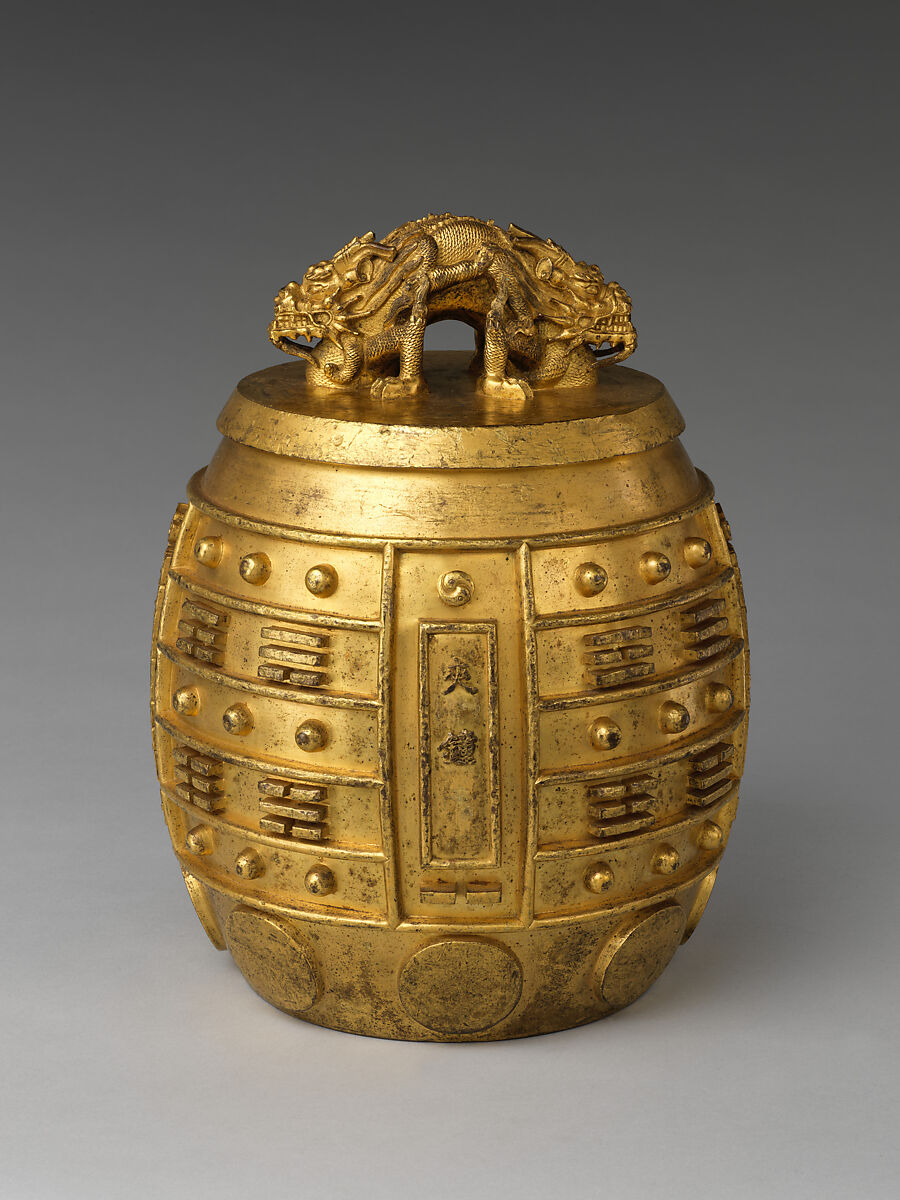 After the stabilization of the country, Emperor Kangxi implemented a reform of ceremonial music in 1713. Sets of chime bells were collectively capable of producing twelve full notes and four double notes. These bells feature contemporary designs, not archaic motifs: either dragons among clouds or the eight trigrams, as here. Heavily cast with crisp ornament in high relief, this fully gilt bell demonstrates the superb craftsmanship of the imperial commission.