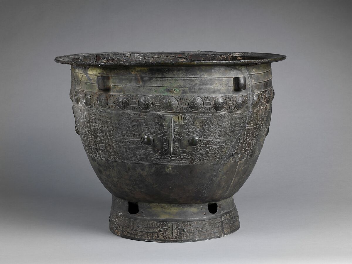 This large water container was used for ablution during the sacrificial rituals of ancient China. Whereas most contemporary water containers have loop handles, this rare example features four holes in its foot and four lugs on its neck through which ropes can be attached for carrying. The incised decoration on its surface consists of four masks of an imaginary animal—known as taotie—meant to inspire deference and awe among participants of the rituals.