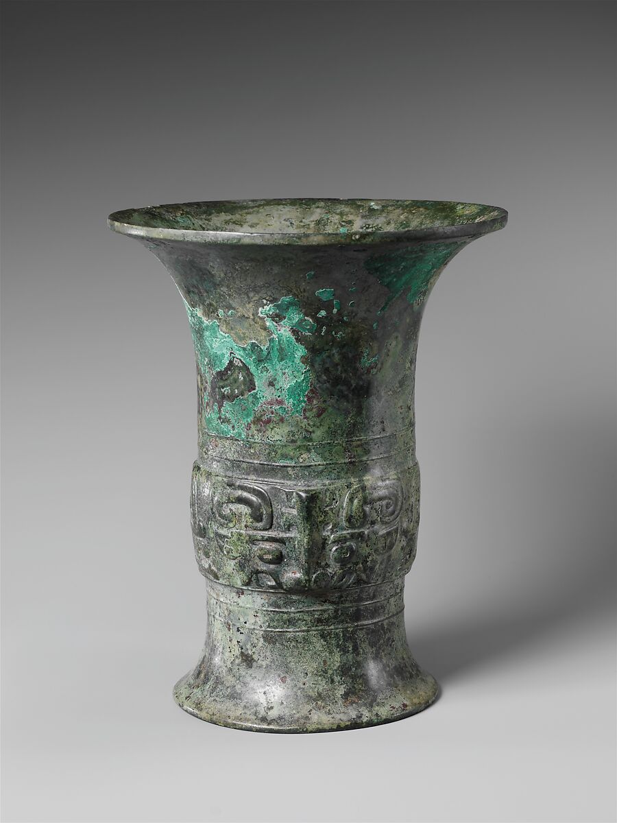 This ritual wine vessel, called a zun, has a wide, flared lip to facilitate pouring. The center section bears the most common decorative motif of Shang and Zhou bronzes—a stylized animal “mask” called a taotie.