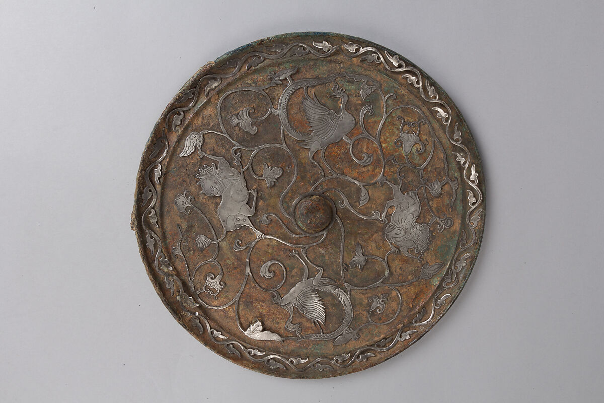 The silver décor on the back of this mirror originally would have been inlaid into a lustrous lacquer ground, which has since deteriorated.