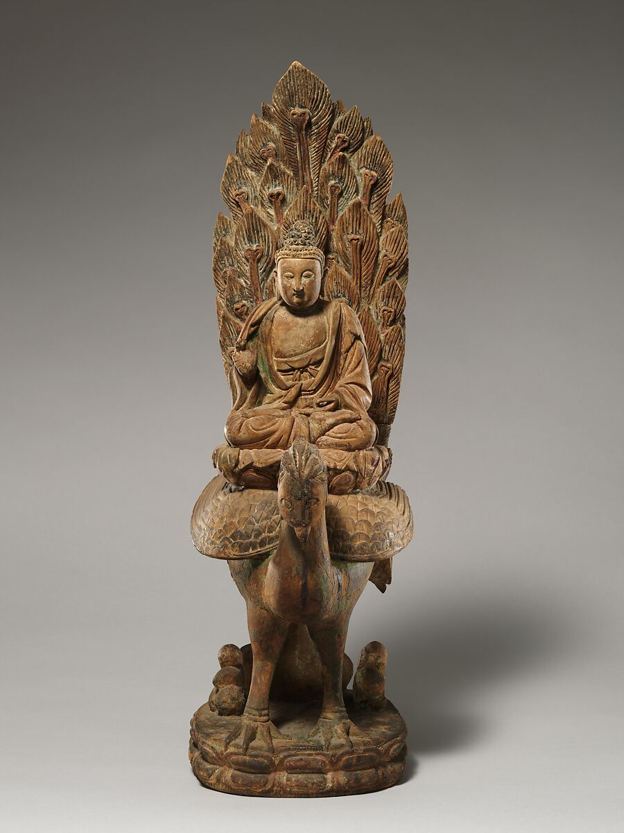 This is a rare representation of a Buddha riding on a peacock. The choice of mount suggests that the figure may be Buddha Amitabha, celestial Buddha of the West.