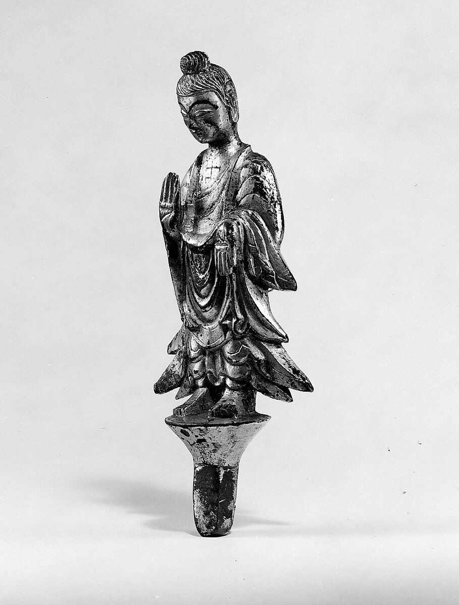 This small figure was part of a larger altarpiece, as is indicated by the tang under its pedestal. For comparison, see 38.158.1a-n in the collection.