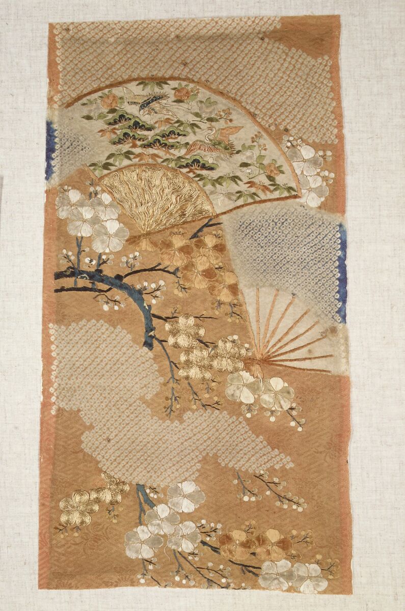 This fragment's auspicious patterning brings together a flowering plum tree and fans, one of them decorated with a pair of cranes among pine boughs, bamboo, and mandarin orange blossoms and fruit. The tiny, densely spaced kanoko spots of the textile's clouds and blue fan are typical of the kanoko shibori technique of the mid-seventeenth century.