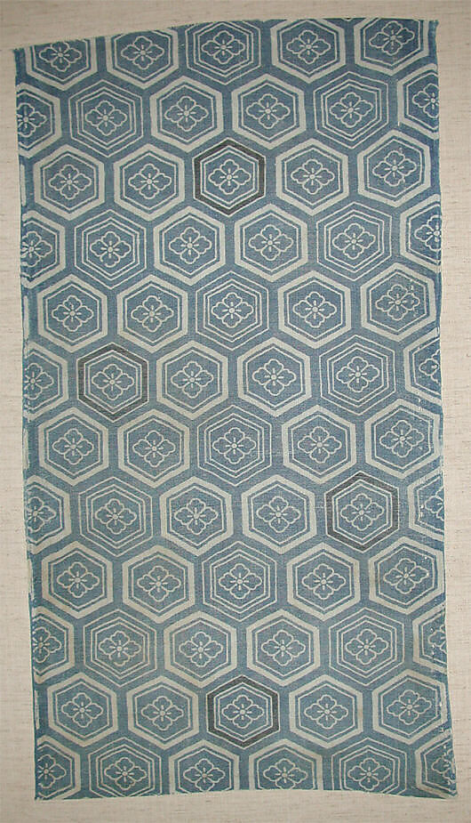 One limitation of stencils is that they cannot accommodate patterns of rings because the middle falls out if a circle is cut into paper. Japanese stencil carvers and dyers avoided this problem by reinforcing stencils with thread or by using two stencils, one for part of each ring and a second for the rest. Because the hexagons and floral patterns in this textile are completed ringlike forms, either a double stencil or a single thread-reinforced stencil must have been used.