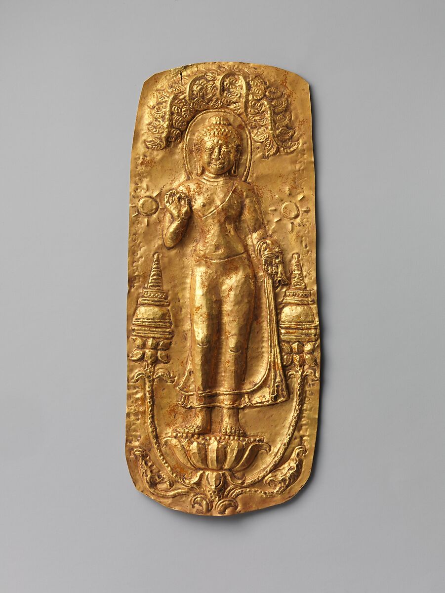 This Buddha holds his right hand in a teaching gesture (vitarkamudra) and stands under a tree that alludes to Bodhgaya, the place of his enlightenment. Such gold plaques were sometimes buried as a foundation deposit prior to the construction of a temple.