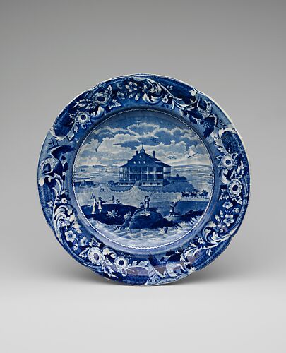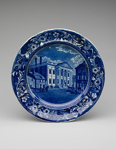 This blue and white transfer-printed earthenware soup plate made by the Staffordshire firm of Joseph Stubbs features a view of Fairmount Park near Philadelphia, Pennsylvania. Stubbs included the view in its series of approximately seventeen architectural and scenic American views with standard borders of spread eagles, flowers and scrolls, which it produced for the United States export market. Fairmount Park, also known as Fairmount Gardens, served as the grounds for the Fairmount Water Works built in the neoclassical style from 1812 to 1824 after designs by Philadelphia engineer Frederick Graff (1774–1847). Providing a scenic setting for one of the nation's first hydraulic-powered pumping systems and also constituting one of the nation’s first public parks, Fairmount Park quickly became a popular nineteenth-century tourist attraction. The site was frequently portrayed on transfer-printed export wares. Other views of the Water Works, Park and connecting bridges appear, for example, on a plate, 14.102.301, by Job & John Jackson (1831–1835), a dish, 14.102.220, by William Ridgway, Son & Co. (ca. 1836–1848) and a plate, 14.102.290, by Enoch Wood & Sons (1818–1846). Stubbs' view of Fairmount Park was based on a drawing by English-born Philadelphia artist Thomas Birch (1779–1851) engraved by Robert Campbell (1806–1831) and published in 1824. Birch's composition was also used for a similar view of Fairmount Park on a plate, 16.83.7, by Henshall & Co. (1790–1838). Another Birch composition depicting the Upper Ferry Bridge at the Fairmount Water Works inspired a view on a plate, 10.57.14, by Stubbs. The American Wing's collection also contains additional pieces by Stubbs. Refer to the Dictionary for a definition of the term "transfer printing" and for information about the above-mentioned firms.