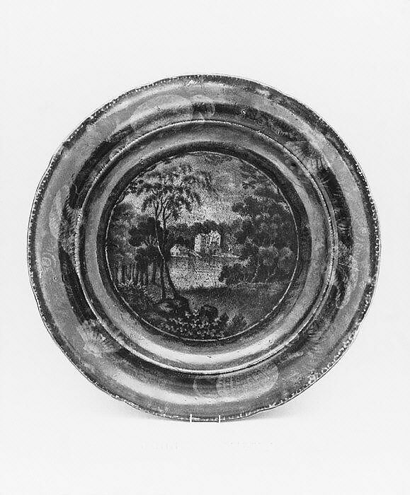 This blue and white transfer-printed earthenware plate made by the Staffordshire firm of Enoch Wood & Sons features a view of Gilpin’s Paper Mills on the Brandywine Creek in Wilmington, Delaware. The Mills stood on Gideon Gilpin's farm where a wounded General Lafayette (1757–1834) was carried from the Battle of Brandywine during the American Revolutionary War. Lafayette revisited the farm during his historic visit to the United States in 1824. The Mills were also famous for operating the first cylinder paper machine in America beginning in about 1817 at one of the mills operated by Thomas Gilpin, Gideon’s son. Wood & Sons based its view of the Mills on a drawing by Philadelphia artist B. K. Fox (active ca. 1828–1835) reproduced as an engraving in about 1820 by Philadelphia engraver J. (Jacob?) Lybrand (active 1820s). Wood & Sons included the view in its series of approximately thirty-one Canadian and American scenic views with symmetrical shell borders produced for the North American export market. The American Wing's collection contains additional pieces by Wood & Sons. Refer to the Dictionary for a definition of the term "transfer printing" and for information about Wood & Sons.
