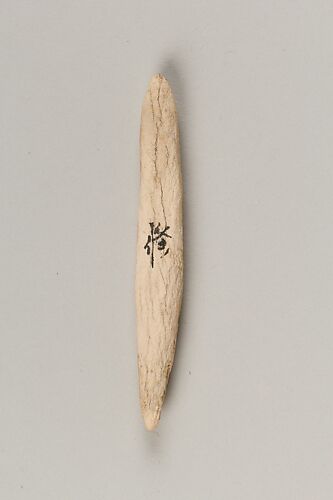 The Jōmon period is the earliest period in Japanese history, lasting from roughly 14,000 to 300 BCE. The Jōmon people were primarily hunter-gatherers, hunting land animals and gathering vegetables and nuts on the land as well as hunting and fishing at sea. Harpoon heads such as this one testify to the importance of seafood in the diets of some Jōmon communities, especially those close to the sea. Fish bones found at Jōmon archaeological sites indicate that the Jōmon hunted fish not only close to the shore but also farther out in the open sea, where larger fish could be caught. There is even evidence that the Jōmon ate pufferfish, a poisonous fish considered a delicacy in modern Japan.