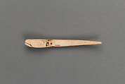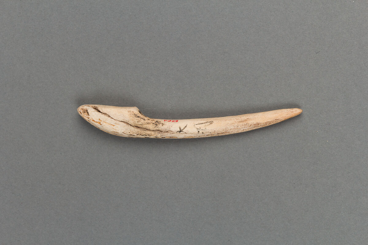 The Jōmon period is the earliest period in Japanese history, lasting from roughly 14,000 to 300 BCE. The Jōmon people were primarily hunter-gatherers, hunting land animals and gathering vegetables and nuts on the land as well as hunting and fishing at sea. Harpoon heads such as this one testify to the importance of seafood in the diets of some Jōmon communities, especially those close to the sea. Fish bones found at Jōmon archaeological sites indicate that the Jōmon hunted fish not only close to the shore but also farther out in the open sea, where larger fish could be caught. There is even evidence that the Jōmon ate pufferfish, a poisonous fish considered a delicacy in modern Japan.