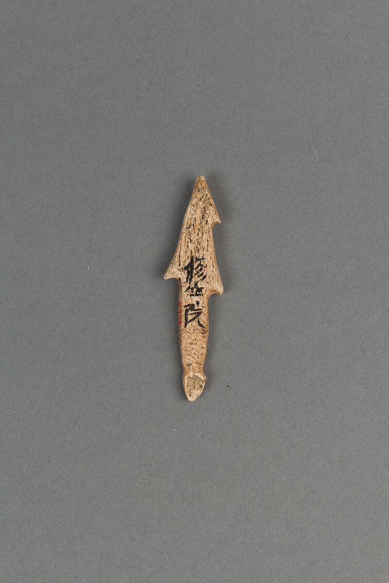 The Jōmon period is the earliest period in Japanese history, lasting from roughly 14,000 to 300 BCE. The Jōmon people were primarily hunter-gatherers, hunting land animals and gathering vegetables and nuts on the land as well as hunting and fishing at sea. Harpoon heads such as this one testify to the importance of seafood in the diets of some Jōmon communities, especially those close to the sea. Fish bones found at Jōmon archaeological sites indicate that the Jōmon hunted fish not only close to the shore but also farther out in the open sea, where larger fish could be caught. There is even evidence that the Jōmon ate pufferfish, a poisonous fish considered a delicacy in modern Japan.