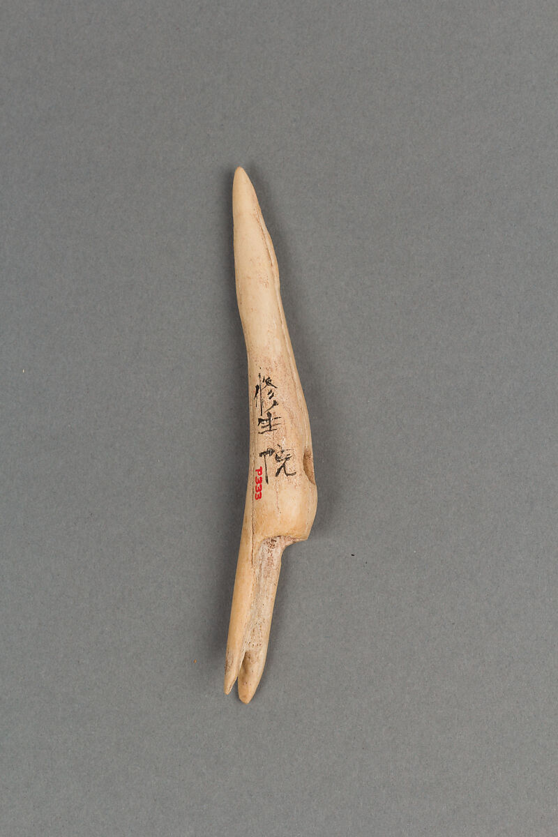 This object is from a large collection of various implements—fishhooks, needles, and harpoons—that were carved from bone, a material worked by Japanese artisans since Paleolithic times. They were found in the Ōhora shell midden (Ōhora kaizuka 大洞貝塚) near Ōfunato Bay, Iwate Prefecture, in the Tōhoku region of northern Japan. According to information gleaned from shell mounds, or middens, the people of the Jōmon period relied on a variety of strategies to obtain food. The large number of fishhooks, fashioned with and without barbs, together with the rich array of marine remains found in these rubbish heaps since very early times indicate that some fifty species of fish and shellfish constituted an essential dietary staple. Toggle-head harpoons, a later innovation, facilitated the hunting of sea mammals. Attaching a line to the toggle allowed the hunter to draw in his prey once the toggle had broken away from the harpoon shaft. Further evidence gathered from these refuse dumps suggests that the Jōmon people also relied heavily on nuts, collected most actively in the autumn, and hunted animals, notably wild boar and deer.