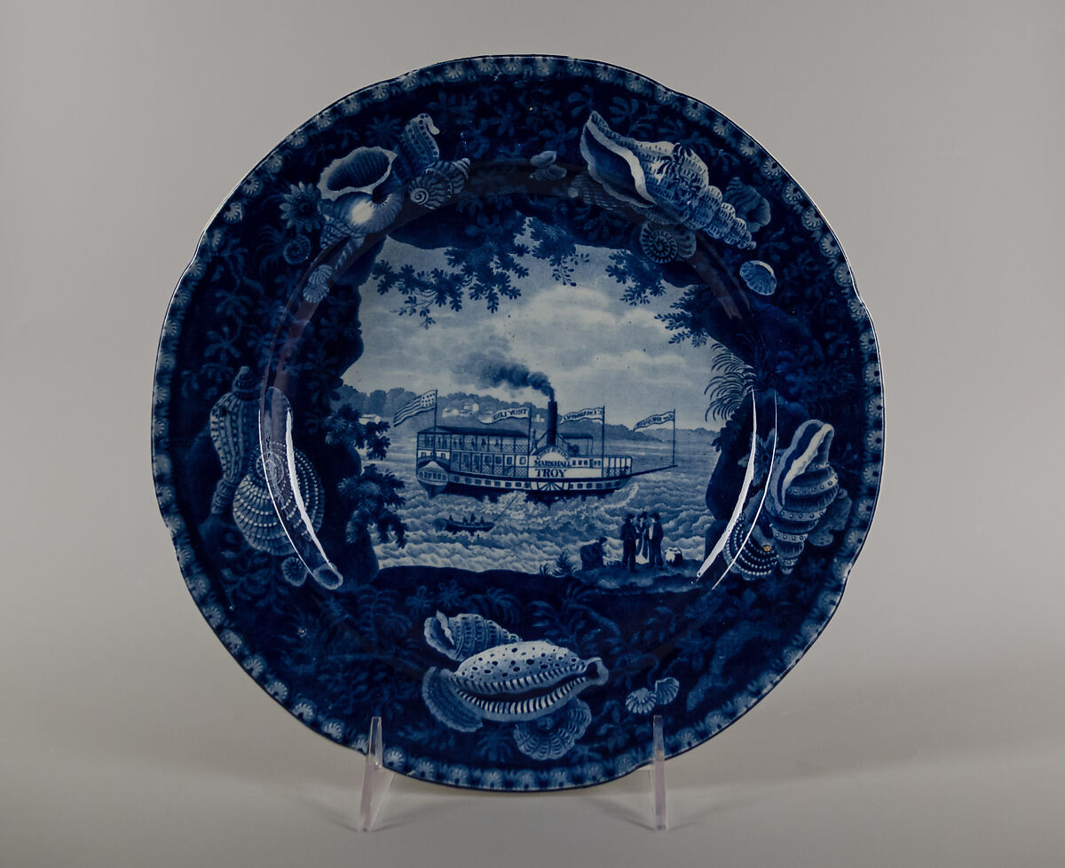 This blue and white transfer-printed earthenware plate made by the Staffordshire firm of Enoch Wood & Sons features a view of the "Chief Justice Marshall," a steamboat operated by the Troy Line on the Hudson River between New York and Albany. Built in 1825, the vessel was named after famous American jurist Chief Justice John Marshall (1755–1835). It navigated the Hudson River from 1826 until the Hartford Steamboat Company transferred the boat to the Connecticut River in 1832. Like all steam-vessels built before 1831, the "Chief Justice Marshall" was fitted with masts for sails in the event of engine failure or the desire to travel faster. Equipped for speed, the "Chief Justice Marshall" became known as the "Race Horse of the North River." River races among steamboats during this period resulted in numerous accidents. The first reputedly befell the "Chief Justice Marshall" in 1830 when her boilers burst and injured many passengers. Symbolic of American technological progress, steamboats were popular subjects for transfer-printed export wares. Other famous examples include Robert Fulton’s "Chancellor Livingston" appearing on a plate, 14.102.288, by James & Ralph Clews (ca. 1815–1834) and a platter, 14.102.102, by Wood & Sons. Wood & Sons' portrayal of the "Chief Justice Marshall” was based on a presently unidentified engraving from the 1820s adapted for the firm's series of approximately twenty-nine predominantly American nautical views with grotto-shaped shell borders produced for the United States export market. The shell border reflects the development of conchology as a new area of scientific study by the early nineteenth century. The American Wing's collection contains additional pieces by Wood & Sons. Refer to the Dictionary for a definition of the term "transfer printing" and for information about the above-mentioned firms.