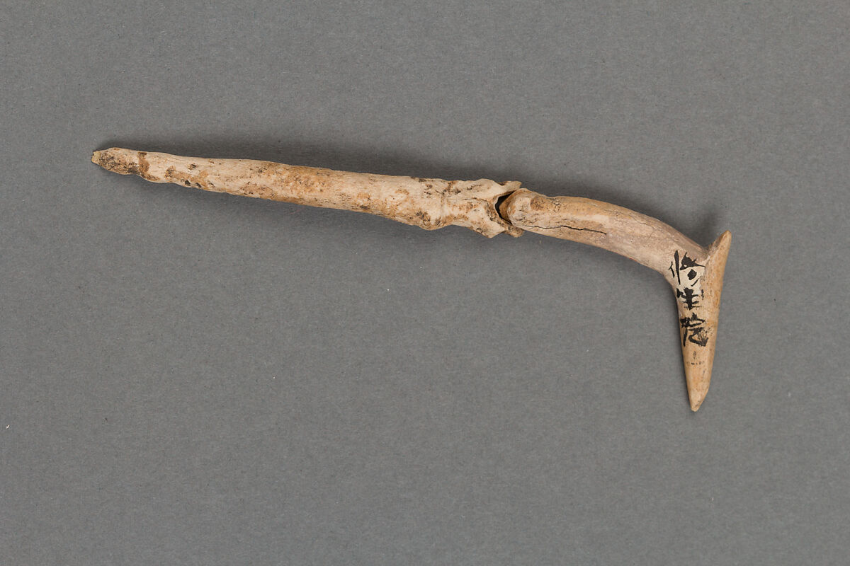 The Jōmon period is the earliest period in Japanese history, lasting from roughly 14,000 to 300 BCE. The Jōmon people were primarily hunter-gatherers, hunting land animals and gathering vegetables and nuts on the land as well as hunting and fishing at sea. Using implements such as this fishhook, Jōmon communities, especially those close to the sea, were able to consume a variety of fish. Fish bones found at Jōmon archaeological sites indicate that the Jōmon hunted fish not only close to the shore but also farther out in the open sea, where larger fish such as tuna could be caught. There is even evidence that the Jōmon ate pufferfish, a poisonous fish considered a delicacy in modern Japan.