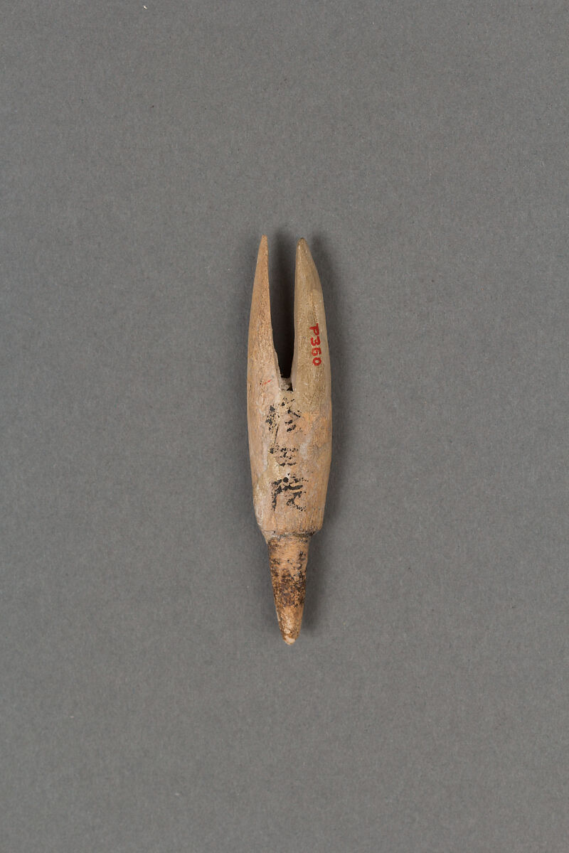 The Jōmon period is the earliest period in Japanese history, lasting from roughly 14,000 to 300 BCE. The Jōmon people were primarily hunter-gatherers, using arrowheads such as this one to hunt a variety of land animals. Archaeological evidence indicates that the Jōmon hunted over 60 species of mammal throughout the Japanese archipelago, including tanuki (Japanese raccoon dogs) and monkeys, both of which would likely be considered unpalatable in contemporary Japanese society.