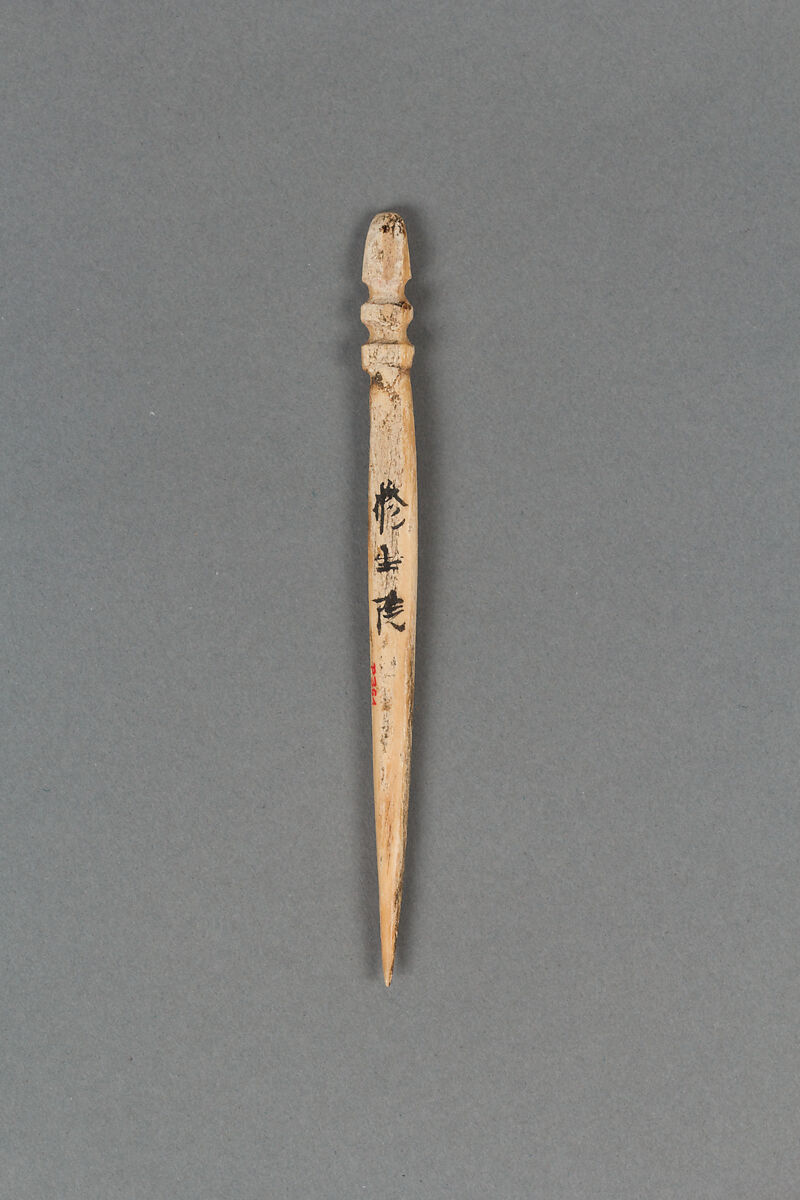 The Jōmon period is the earliest period in Japanese history, lasting from roughly 14,000 to 300 BCE. Using materials such as bone, antlers, and stone, the Jōmon people created not only utilitarian objects, such as harpoons and arrowheads, which supported their hunter-gatherer lifestyle, but also a variety of jewelry and objects used for religious purposes. Hairpins such as this one are relatively common, and may have had a spiritual as well as decorative purpose.