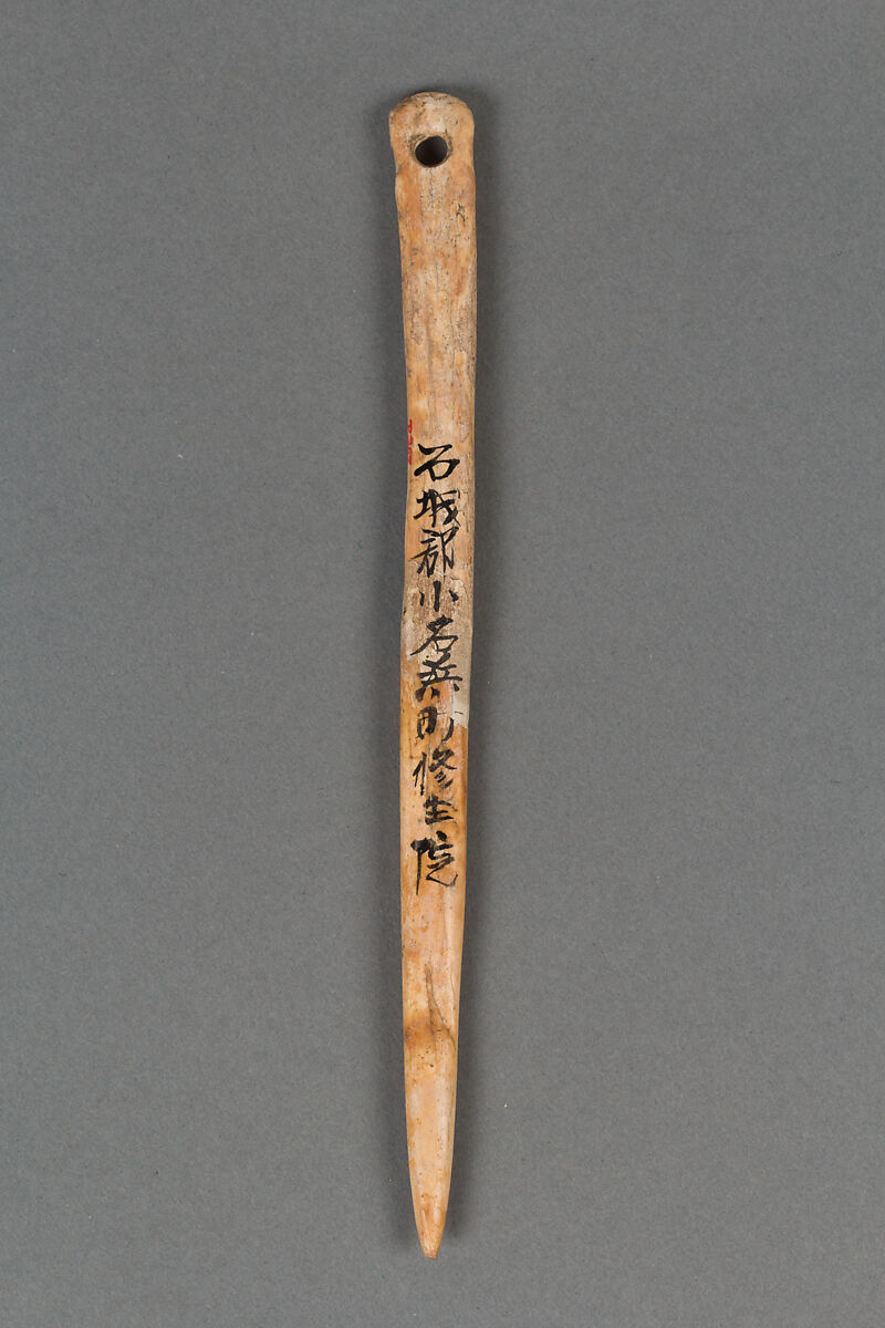 The Jōmon period is the earliest period in Japanese history, lasting from roughly 14,000 to 300 BCE. Using materials such as bone, antlers, and stone, the Jōmon people created a variety of utilitarian objects, such as this needle. The small eye at the top would likely have served a function similar to a modern sewing needle, allowing the Jōmon people to practice basic sewing and create textiles.