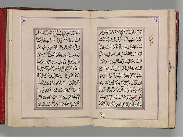 Produced in Kashmir, this Qur'an once served as part of a bride's dowry. The manuscript contains three double page illuminations in a style typical of 19th-century Kashmir, including blue and gold scrolls and flowers, and purple and pink flowers on the inside edges. Gold and red text markers punctuate the fine naskh script, separating verses and indication points for sajadat (prostration).
