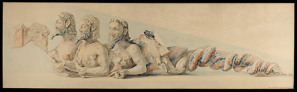 The counterpart to Herakles Wrestling Triton in the right corner of the Hekatompedon pediment is composed of the torsos of three bearded and winged men emerging from a snaky lower body. Although the subject has been variously identified, it was called "Bluebeard" upon its discovery in 1888, and the nickname has stuck. Gilliéron depicted the rightmost head, which was found separately, both by itself and attached to its body. Rendered at full scale, the figures hold attributes of water, fire, and air, suggesting that they personify these elements, if not some larger cosmic concept.