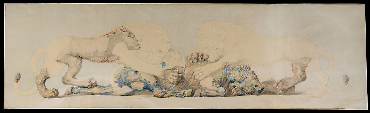 Archaeologists on the Acropolis began finding and reassembling the many fragments of this pediment in 1888, and Gilliéron was drawing them by 1902, probably earlier. Contemporary descriptions emphasize the preserved colors of the sculptures, notably the reds and blues. This rendering is half the size of the original. Gilliéron has lightly suggested parts of the missing animals with graphite and indulged his own coloristic sensitivity in his rendering of the original polychromy.